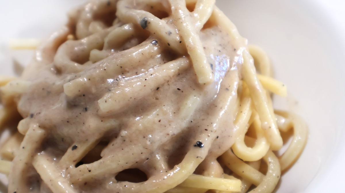 - Ingredienti Selezionati: Pecorino romano DOP (crosta nera), panna vegetale, pepe nero.